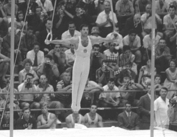 But Azaryan had definitely made his point. And his original skill became known as “The Azaryan” or the Olympic Cross. At the 1954 World Championships in Rome, Azaryan introduced his second eponymous skill, the back roll from hang to iron cross.